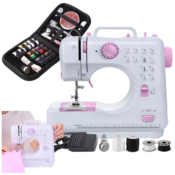 XUEQI Elektronisk symaskin, bärbar minisymaskin, med 12 olika punkter och pedal, halvautomatisk, dubbla trådar-enstaka nål, enstaka huvudmaskin, modell 505