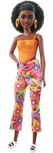 Barbie Fashionistas-docka nr 244 med lilaslingat brunt hår, lila topp med blommönster och matchande kjol med accessoarer som hårband och sandaler, JJN57