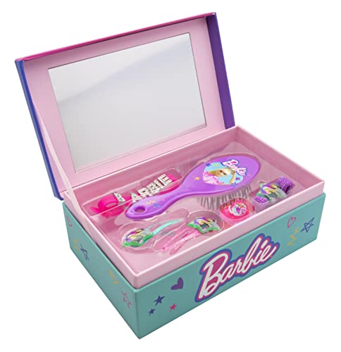 Joy Toy Barbie smyckeskrin med 6 tillbehör: 2 klädnypor, ring, elastiskt hår, armband, borste, tecknad, Multifärg, 22783