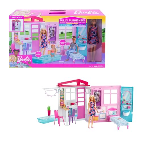 Barbie GWY84 – stuga med docka, möbler och pool, bärbart dockhus ca 46 cm hög med handtag, docktillbehör leksak från 3 år