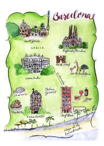 Barcelona, Catalonia, Spain, Journal, Notebook, 200 Pages A5+ lined pages.: Featuring Hand-drawn illustrated map cover with famous landmarks
