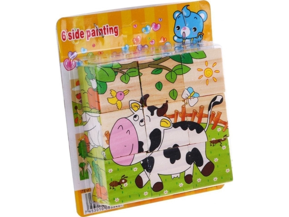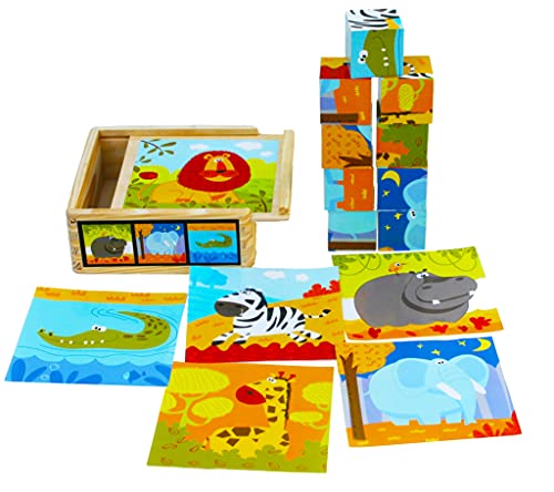 TOWO träklossar kubpussel för barn - träkubpussel 9 träkuber block 6 vilda djur bilder i en trälåda - träleksaker gåva för 2 år