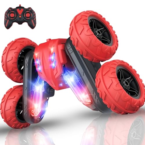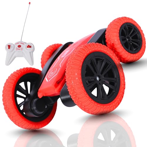 FunFY Racing Stunt RC Toy Car med 4WD | med 360 graders rotation, off-road, dubbelsidig enhet | Anti-slip-vakuumtires, dimspray och uppladdningsbart batteri | Svart och röd | för barn, vuxna