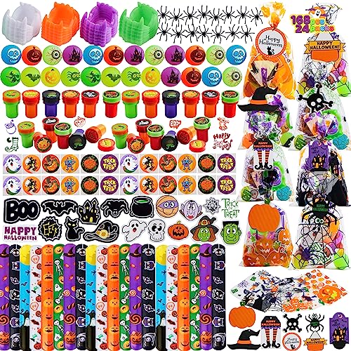 JOYIN Set med 168 st halloweenfest, 24-pack förfyllda godispåsar med presentetikett inklusive vampyrtänder, spindlar, stämplar, klistermärken, slaparmband för barn bus eller godis, presentbyte