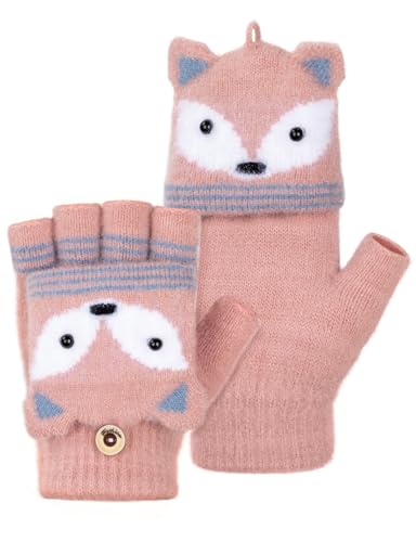 MELLIEX Fingerlösa handskar barn, flip top handskar barn vinter, varm halvfinger vantar för pojkar flickor 5–10 år, Rosa räv, 12.5*10.5cm