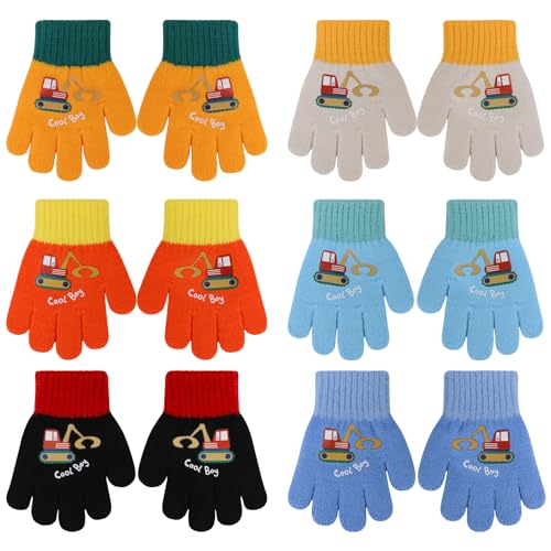 QKURT 6 par stickade handskar för småbarn, barn vinter köldsäkra helfinger stretchhandskar med grävmaskin mönster för 2-4 år pojkar flickor, Flerfärgad, Small (for 2-4 Years)