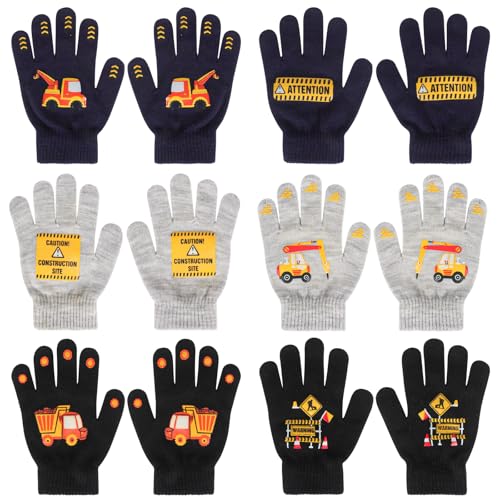 QKURT 6 par magiska handskar för barn, unisex stretch vantar barn varma stickade handskar vinter termisk handske hela fingrar handske kallt väder vantar grävmaskin slogan mönster för pojkar flickor 4