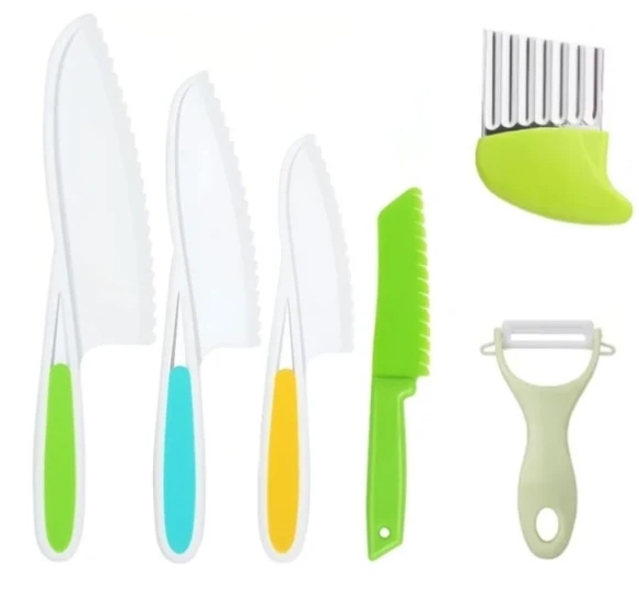Barnkniv 5-delat köksset för barn för att skära och laga frukt eller grönsaker, inklusive skalare säkerhetskniv från 2 år, presentset för barn