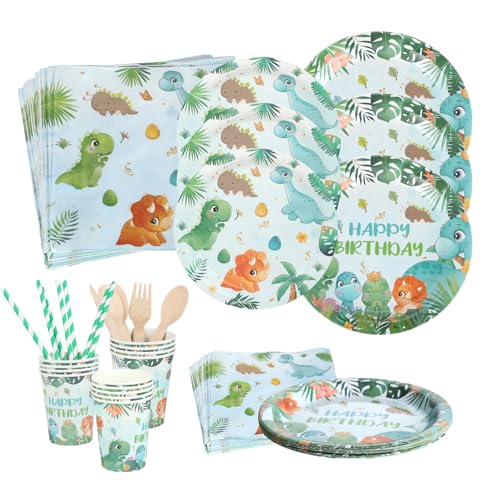DinO Födelsedagsdekoration – 132 delar set med dinosaurie födelsedag – innehåller tallrikar, muggar, servetter, sugrör, bestick – perfekt för födelsedagsfester för barn