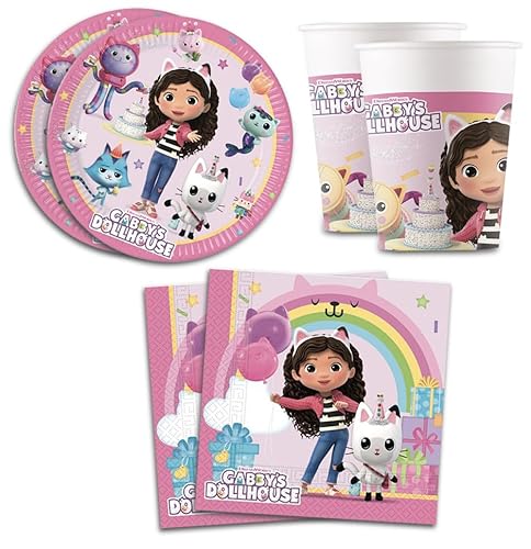 Decoraparty DP-A66164R födelsedagsset Gabby's Dollhouse, set porslin dekoration bordsdekoration för fest karneval halloween tema barn, 8 tallrikar, 20 servetter, 8 muggar för upp till 8 personer