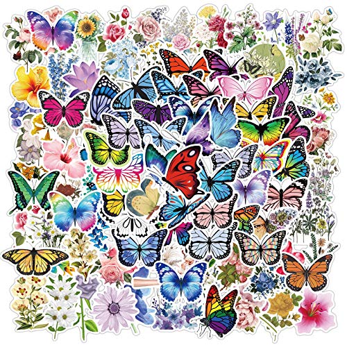 100 stycken fjärils- och blomklistermärken, söta vinylklistermärken, för bagage, skateboard, stötfångare, klippböcker, muggar, klistermärken, present till barn, tonåringar och vuxna
