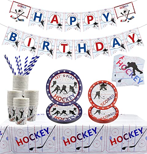 Hockeyfesttillbehör – ishockeytemafestpaket för barn, hockeyfans, födelsedag, speldag – inklusive tallrikar, muggar, servetter, bordsduk, banderoller, för 20 personer (A)