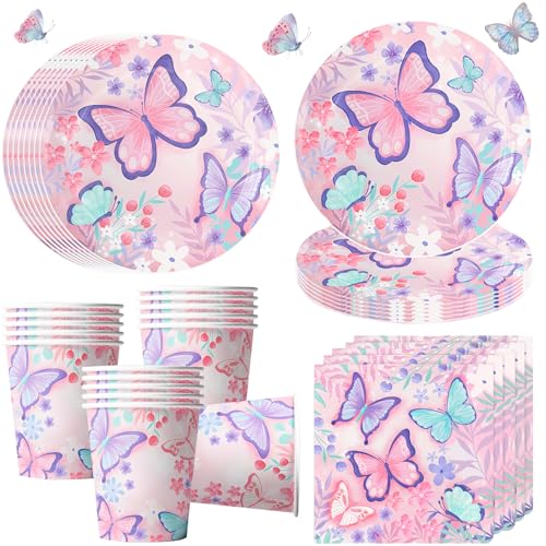 OMZSXK Fjäril, festservis, 16 gäster, fjäril, festtallrikar, födelsedagstallrikar, papperstallrikar, muggar, servetter, födelsedagsdekoration för barn
