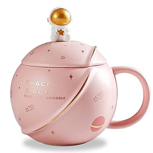 Söt keramisk rymdmugg, kawaii, astronaut-kaffekopp, roliga muggar med lock och sked, personliga koppar för kaffe, te och mjölk, mors dags-gåva, födelsedagspresenter för kvinnor/barn, 400 ml (rosa)