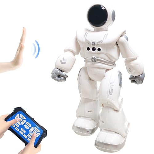 HUSAN Fjärrkontrollsrobot för barn, intelligent programmerbar robot med infraröd styrenhetsleksak, dans, sång, månpromenad och LED-ögon, gestigenkänningsrobotsats (grå)