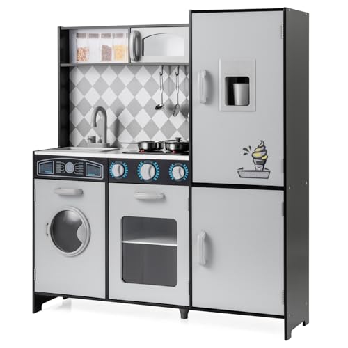 FANTASK Träkök för barn, lekkök med ljus ljud och spis, kökslekset med mikrovågsugn tvättmaskin ugn tillbehör för barn från 3 år, svart
