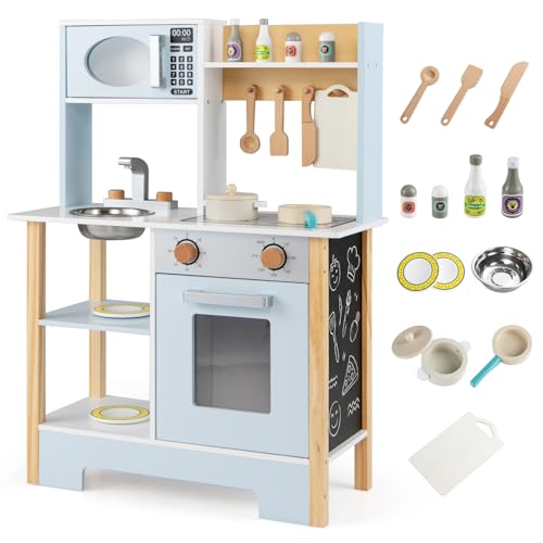 ROBOTIME Barnkök av trä, för flickor och pojkar från 3 år, rollspels-matlagningsset med lampor och ljud, spis, isbitsmaskin och bestick, present till barn från 3–8 år (blå)