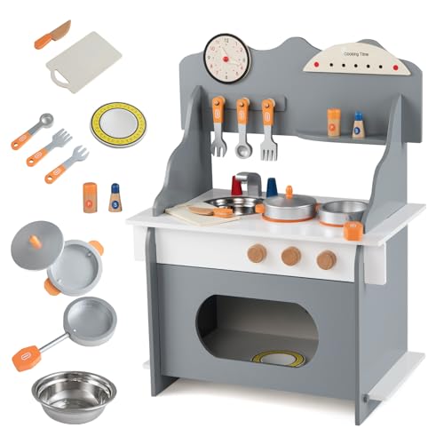Fantaskk Barnkök i trä med klocka och tillbehör i 12 delar, lekkök med spis/ugn/handfat och kryddhylla, leksakskök för barn från 2 år (grå)