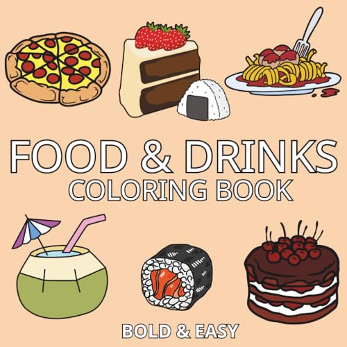 Food & Drinks: Coloring Book For Adults & Kids, Simple and Big Designs Featuring Cute Food, Pizza, Sushi, Ice Cream, Fruits, Cakes, Dessert, Cupcake, Donut and More (Bold & Easy Coloring)