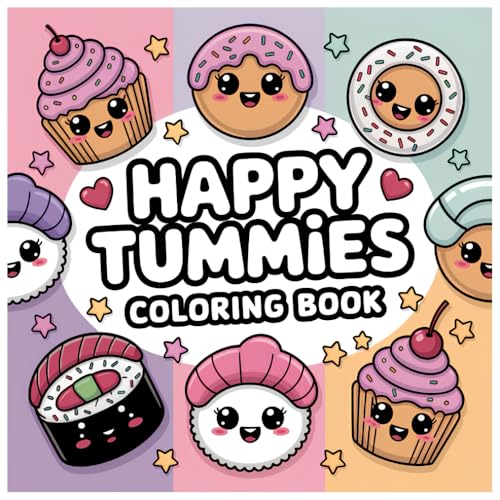 Happy Tummies Kawaii Coloring Book: Adorable Smiling Foods for Kids Ages 4–8 — Cupcakes, Donuts, Sushi, Candy & More!