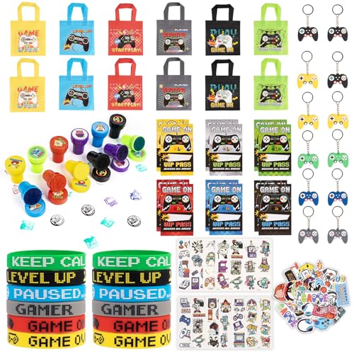 122 stycken videospel party gåvor, pojkar barns födelsedag gåvor med lekmärken nyckelring stämplar silikonarmband presentpåsar tatuering barn gaming give aways pinata fyllning