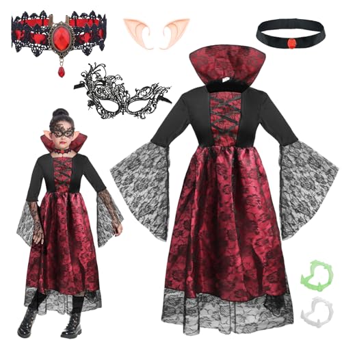 Vampyrdräkt flicka, halloween, vampyrdräkt barn, drottningdräkter, vampyrklänning, utklädnad med mask, halsband, tänder, tatuering för barns födelsedag, halloween, karneval, kostym, cosplay (XL)