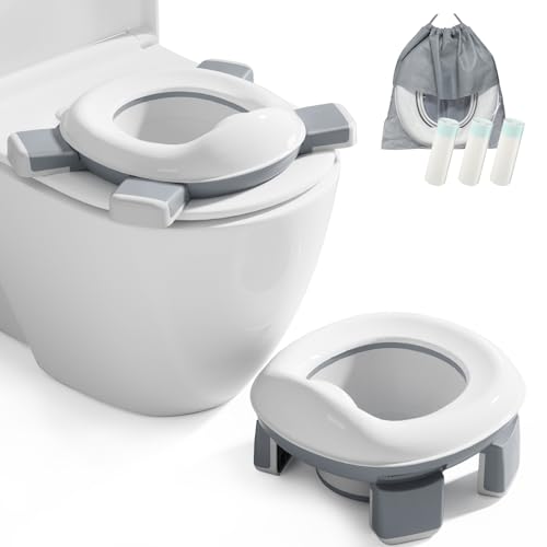 DEANIC 2-i-1 resepotta för småbarn, potträning toalettsits för 1-4 år pojkar flickor, bärbara potties med 60 st pottyliners utomhusbruk, vikbar resetoalett barn campingpark (grå)