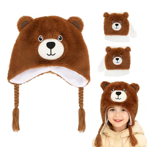Hifot Flickors hatt och handskar barnset, flickor vintermössor och handskar för barn, fluffig öronlapp björn mössa med björn vinter vantar för barn, flickor jul kallt väder accessoarer set gåva