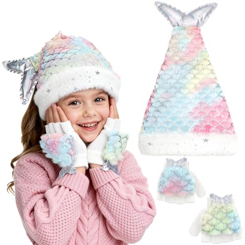 Hifot Flickors hatt och handskar barnset, flickor vintermössa och handskar för barn, fluffig öronlapp sjöjungfru mössa med sjöjungfru vinter vantar för barn, flickor jul kallt väder accessoarer set