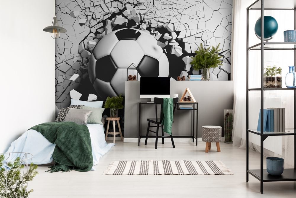Fototapet -Soccer ball breaking forcibly through a white wall 3d illustration - Tonårsrum - Scandiwall - Barn