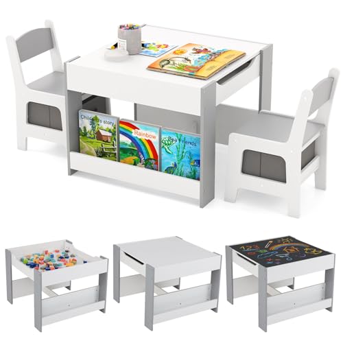 COSTWAY 3 delar. Barnstolsgrupp, barnbord med 2 stolar, 4-i-1 aktivitetsbord med förvaringsutrymme och avtagbart lock, multifunktionell barnstolsuppsättning för småbarn från 3 år, grå