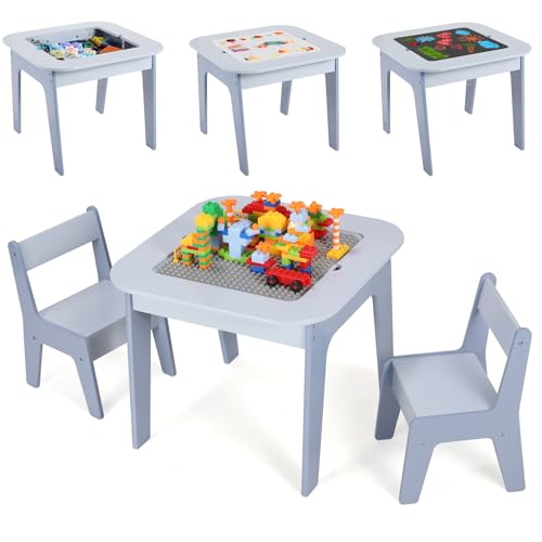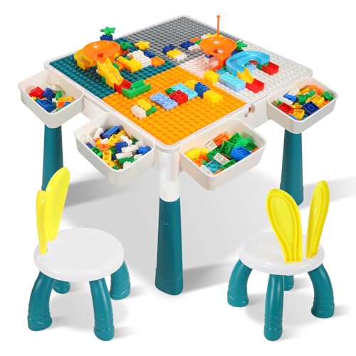 Peviasot Barnbord, barnstolsgrupp med 2 stolar, spelbord, höj- och sänkbart aktivitetsbord, set med 251 stycken byggstenar, multifunktionella byggstenar set för barn, byggsten