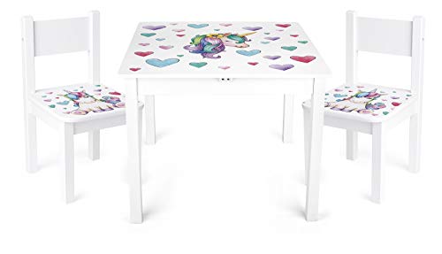 Leomark barnbord med 2 stolar 60x60x42(H) cm, barnbord med stolar trä, barnbord och stolar perfekt för hem och dagis, barnstolar, bord i stol set, barnmöbler med UV-utskrift Enhörning