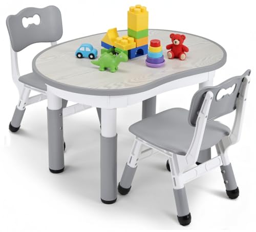Barnbord med 2 st stolar, höjdjusterbart barnbord och stol, plaststol, jordnötsform, för hem/daghem, dagis, grå