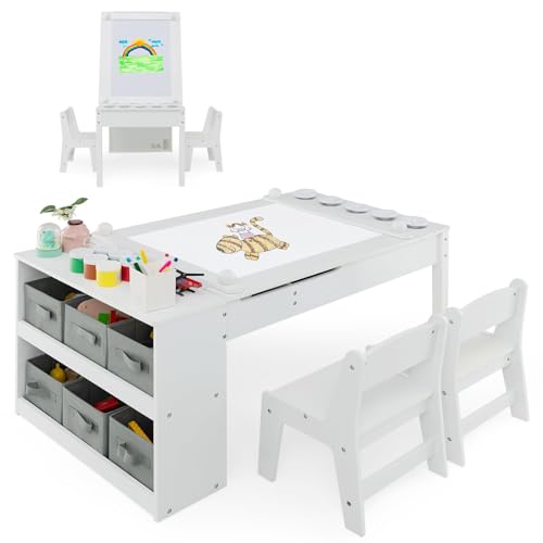 COSTWAY Barnbord med 2 stolar, 3-i-1 aktivitetsbord och staffli av trä med lyftbar bordsskiva med färgade koppar, 6 tygbehållare och pappersrulle, barnstolsgrupp för från 3 år (vit)