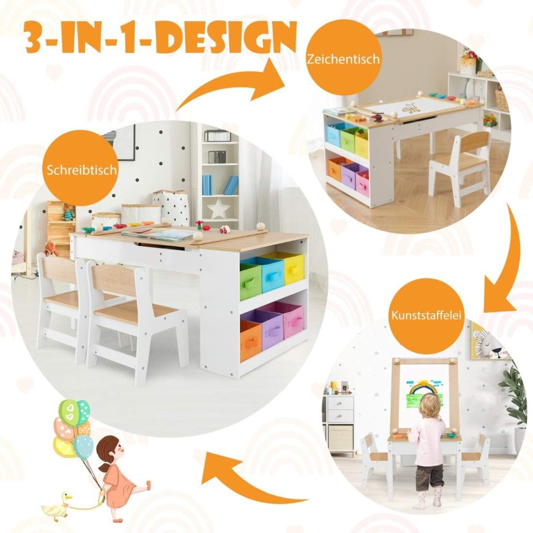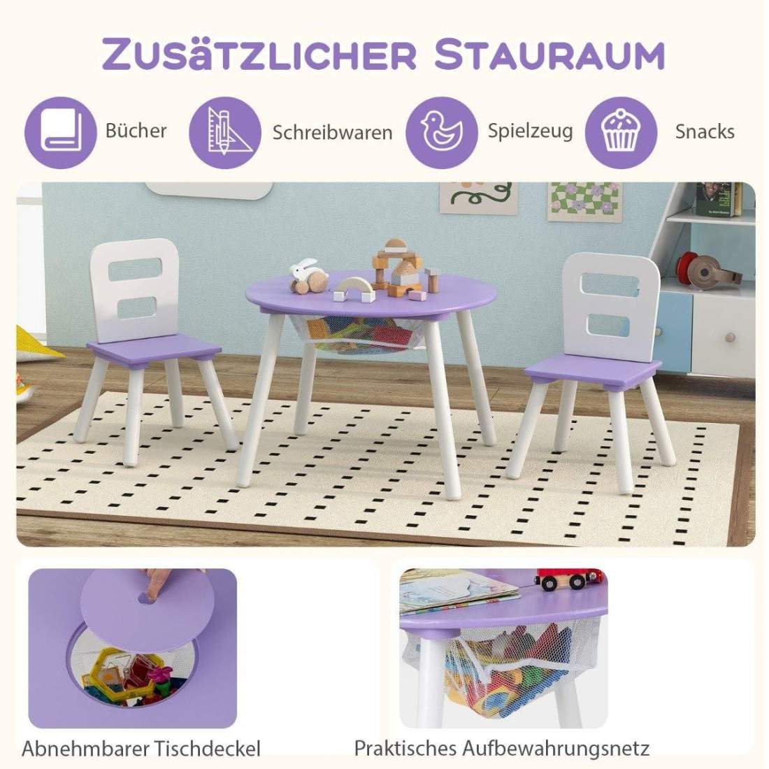 Lestarain barnbord med 2 stolar, barnbord med förvaringsutrymme, barnmålarbord, barnmöbelset, 4 förvaringsfack