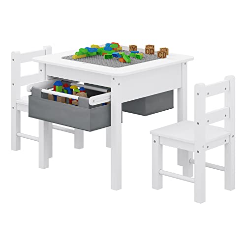 Lestarain barnbord med 2 stolar, barnmöbelset med förvaring, stort blockspelsbord, multifunktionellt aktivitetsbord för barn, utdragbara förvaringslådor, vit grå