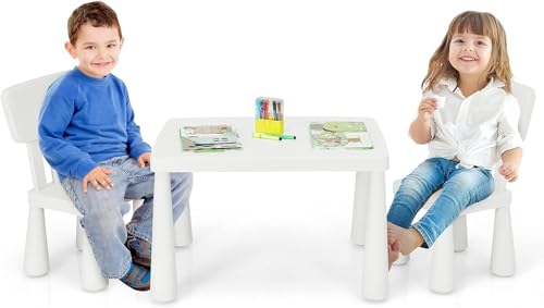 COSTWAY 3 delar. Barnstolsgrupp, barnbordsgrupp, barnbord med 2 stolar, barnmöbler av plast, barnbordsset för dagis och barnrum (vit)