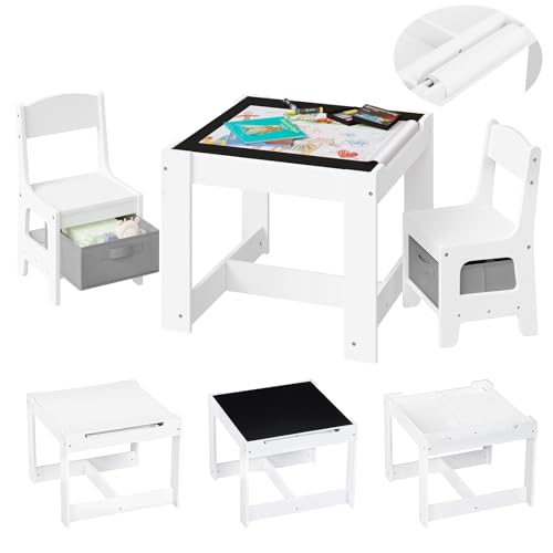 LIFEZEAL 3-i-1 barnstolsgrupp av trä, barnbord med 2 stolar, barntavla, pysselbord och studiebord, barnmöbler, barnrummet, inomhus med pappersrulle och förvaringsutrymme, från 3 år (grå)