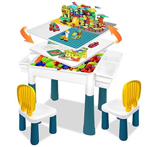 LZQ Barnbord med stolar 6-i-1 barnbord stol set multifunktion byggstenar spelbord med förvaringsutrymme dubbelsidig bordsskiva höjdjusterbar lämplig för barn inlärnings- och tänkningskövningar