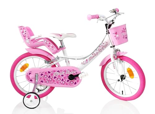 Dino Bikes – 14 tums barncykel Frost – flickcykel med avtagbara stödhjul från 3 år – barncykel med framkorg och dockhållare – justerbar sadel- och styrhöjd (vit, blå)