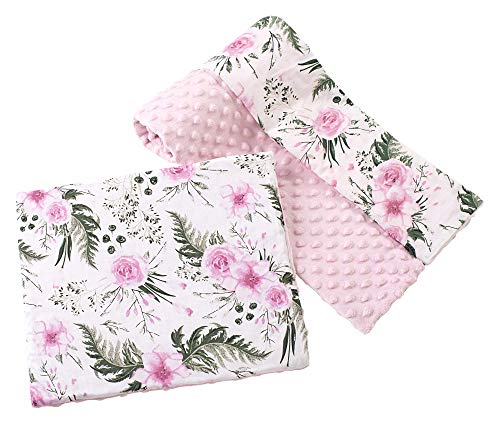 Medi Partners Babyfilt krypfilt med kudde 100% bomull minky barnfilt 55 x 75 + 35 x 30 cm multifunktionell för barnvagn, babystol, vagga (blommig med ljusrosa minky)