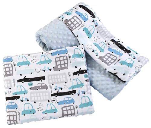 Medi Partners Babyfilt krypfilt med kudde 100% bomull minky barnfilt stor dubbelsidig 75 x 100 + 35 x 30 cm multifunktionell för säng barnvagn (bilar med ljusblå minky)