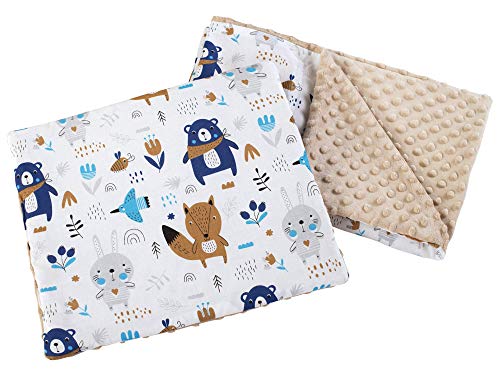 Medi Partners Babyfilt med kudde, 100% bomull, minky barnfilt 55 x 75 + 35 x 30 cm, multifunktionell för barnvagnar, babystol, vagga (djur i skogen med beige Minky)