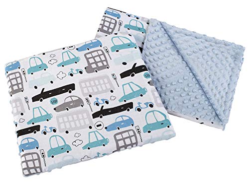Babyfilt krypfilt med kudde 100% bomull MINKY barnfilt 55 x 75 + 35 x 30 cm multifunktionell för barnvagn, babystol, vagga medi partners (bilar med ljusblå minky)