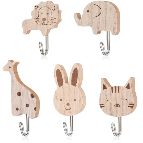 Alriedy Klädkrokar barn barngarderob krokar set om 5 djurväggkrokar av trä, självhäftande för barnrum, sovrum, dekoration (djurformar)