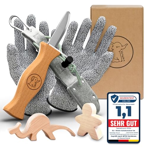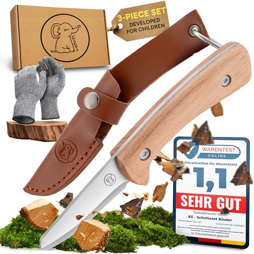 Eli® Snidkniv Barn Set från 6 år – högkvalitativt barnkniv snidset inkl. skärbeständiga handskar – barnsnidkniv – snidverktyg – friluftskniv
