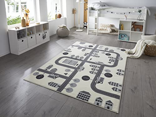 Hanse Home Matta barnrum barnmatta Town – pojke flicka lekmatta kort lugg matta modern lekgata vägmotiv, mjuk lugg, lättskött – kräm, 160 x 220