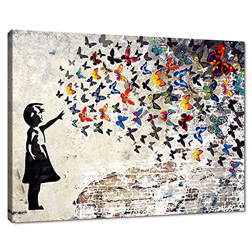 Gata Väggkonst Banksy Målning - Stor Inramad Graffiti Flicka Med Fjäril - Canvastryck För Barnrum Sovrum - Redo Att Hänga - 45 cm B x 24 H