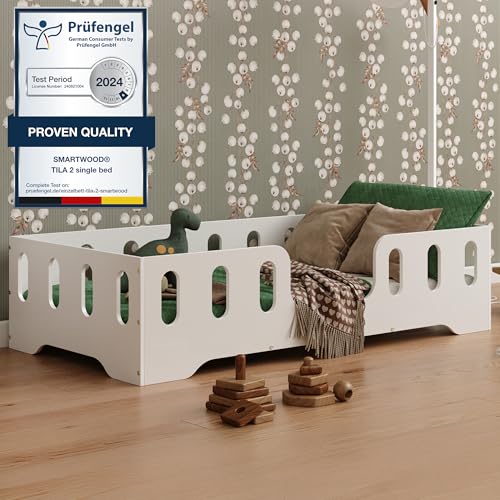 SMARTWOOD TILA 2P Barnsäng 70x160 med ribbotten och fallskydd - Nyhet - Träsäng för pojkar och flickor - Mångsidig Montessorisäng med fallskydd 160x70 cm
